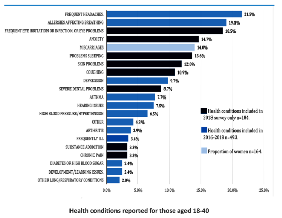 affecting breathing (19.1%). Frequent eye irritations or infections or other eye problems were reported by 18.5%, 14.7% reported anxiety, 13.6% problems sleeping, and 12% reported skin problems. These were followed by coughing (10.9%), depression (9.7%), severe dental problems (8.7%), asthma (7.7%), hearing issues (7.5%) and high blood pressure (6.5%).