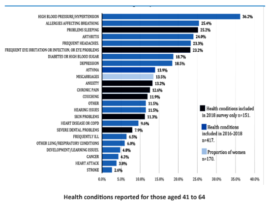 The most commonly reported health problem was high blood pressure or hypertension (36.2%). Roughly 1 in 4 reported allergies affecting breathing (25.4%), problems sleeping (25.2%) arthritis (24%), frequent headaches (23.3%) and frequent eye irritation or infections or eye problems (23.2%). About 1 in 5 reported diabetes (18.7%), depression (18.5%), with 13.2% reporting anxiety and 13.9% reporting asthma. Additional health problems were reported by 12% or fewer in this age group. Among women in this age group, 13.5% were reported to have experienced a miscarriage.
