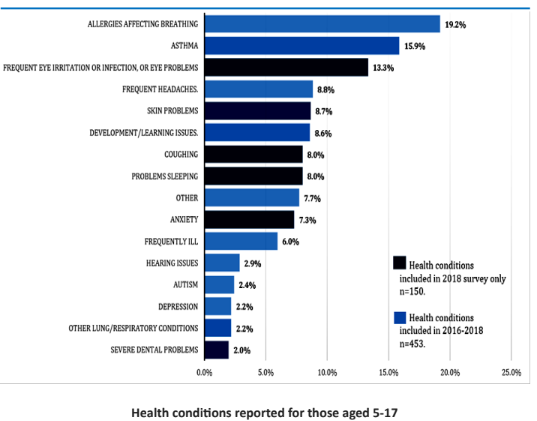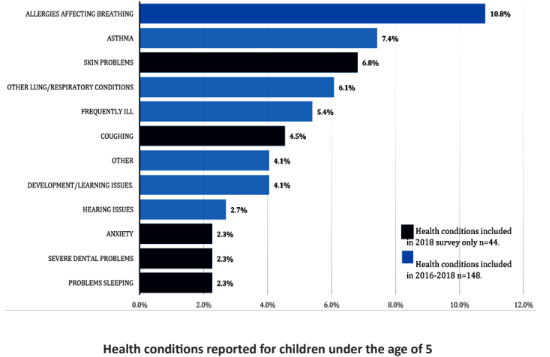 Of the 148 children under the age of 5 on whom data was obtained, 10.8% were reported to have allergies affecting breathing, followed by asthma (7.4%), skin problems (6.8%), and other lung/respiratory conditions (6.1%). Between 4-5% of children under 5 were reported to have frequent illnesses, coughing, other health issues not included in the pre-identified list, and developmental/learning issues.