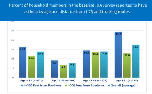 The prevalence of reported asthma among children under the age of 18 in the GHIB area was 13.8%. Among those living 500 feet or less from I-75 or trucking routes through the GHIB area, the prevalence was 16.3%. Prevalence of reported asthma for those aged 65 and older living 500 feet or less from I-75 or trucking routes was 24.4%, compared to 12.9% for those in this age group living more than 500 feet from those roadways.